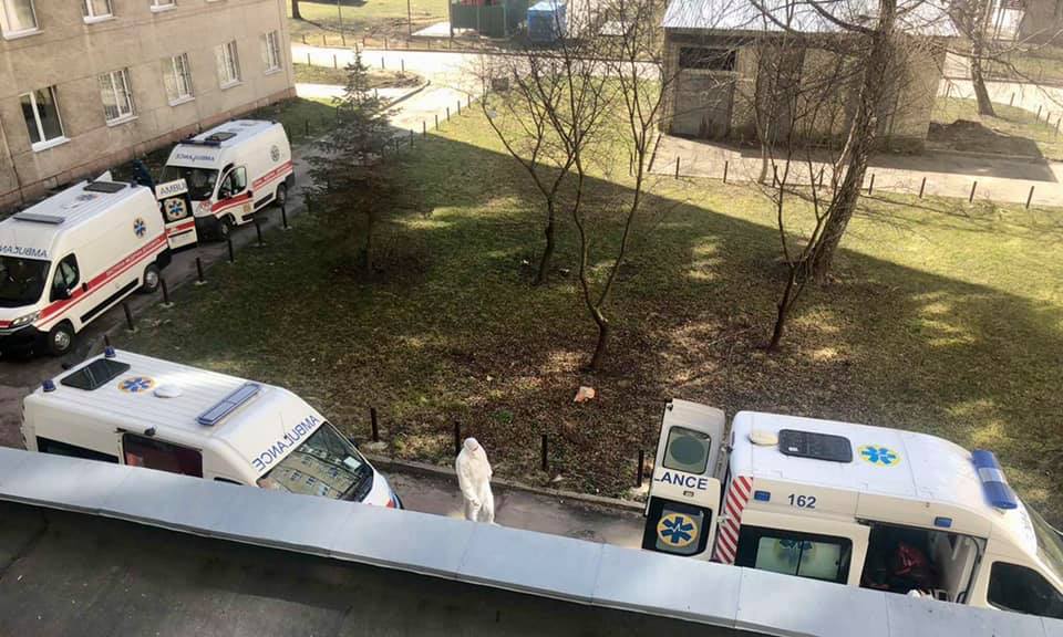 Возле Львовской больницы скорой помощи образовалась очередь из автомобилей скорой помощи, которые привозят больных с коронавирусом.
