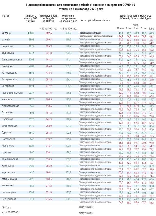 Самыми загруженными являются больницы Полтавской (93%), Житомирской (81,1%), Ровенской (79,2%), Херсонской (74,4%) и Одесской (73,5%) областях. В Киеве заняты 64,2% таких коек. 50% и больше всего больничных кроватей свободны лишь в трех регионах - Черкасской (43,2%), Кировоградской (44,1%) и Николаевской (50%) областях.