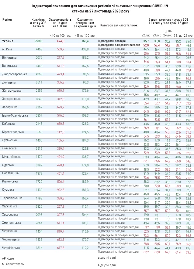 В среднем в стране заполнены 49,9% больничных коек. Самая плохая ситуация в Полтавской (71,3%), Николаевской (64,6%), Черниговской (63,5%), Запорожской (62,4%) и Волынской (62,4%) областях. В Киеве заполнены 54,4% коек.