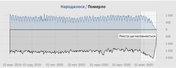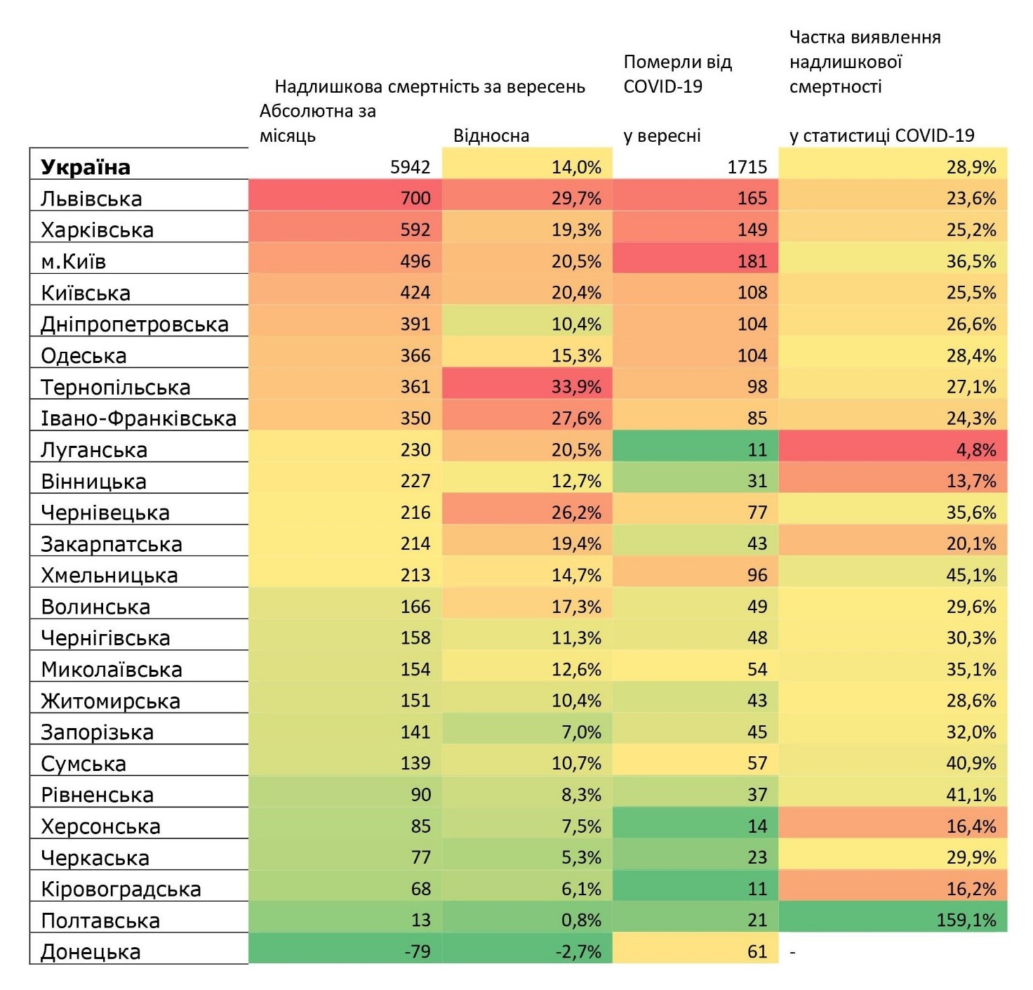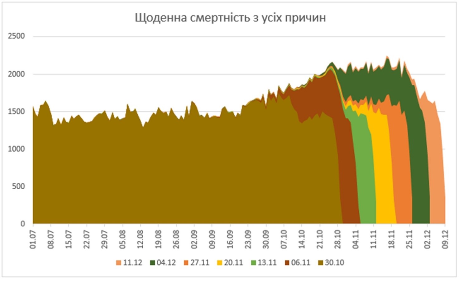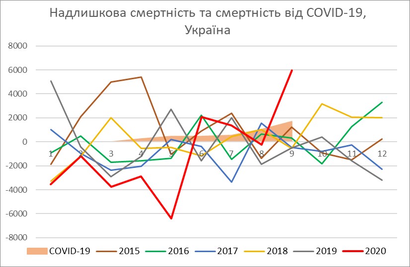 В общенациональной статистике Украины до последнего времени существенной избыточной смертности, которая могла быть однозначно связана с COVID-19, не наблюдалось совсем. Ежемесячные данные Госстата показывали устойчивое уменьшение количества смертей, которое было частью многолетнего нисходящего тренда: на него влияли также аномалии о количестве смертей в областях, подвергшихся частичной оккупации, — Донецкой и Луганской. Складывалось поверхностное впечатление, будто статистика Минздрава о распространении вируса — это одно, а демографическая статистика Госстата — нечто совсем иное, потому что в течение первого полугодия 2020 года смертность в Украине была наиболее низкой за последние пять лет.