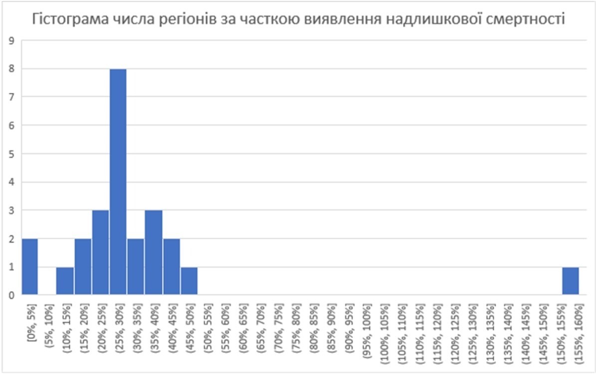 На рис. 4 регионы расположены по спаду абсолютной избыточной смертности. Кроме того, что в регионах с высокой избыточной смертностью было много покойников с подтвержденным диагнозом COVID-19, «доля выявления избыточной смертности» там менялась довольно слабо. На рис. 5 показана гистограмма количества регионов по «доле выявления избыточной смертности», и подавляющее большинство их концентрируется в диапазоне 25–30% или вокруг него. Заметные исключения составляют Луганская и Донецкая области, которые давно демонстрируют аномальное демографическое поведение, а также Полтавская область, где в сентябре был лишь 21 летальный случай.