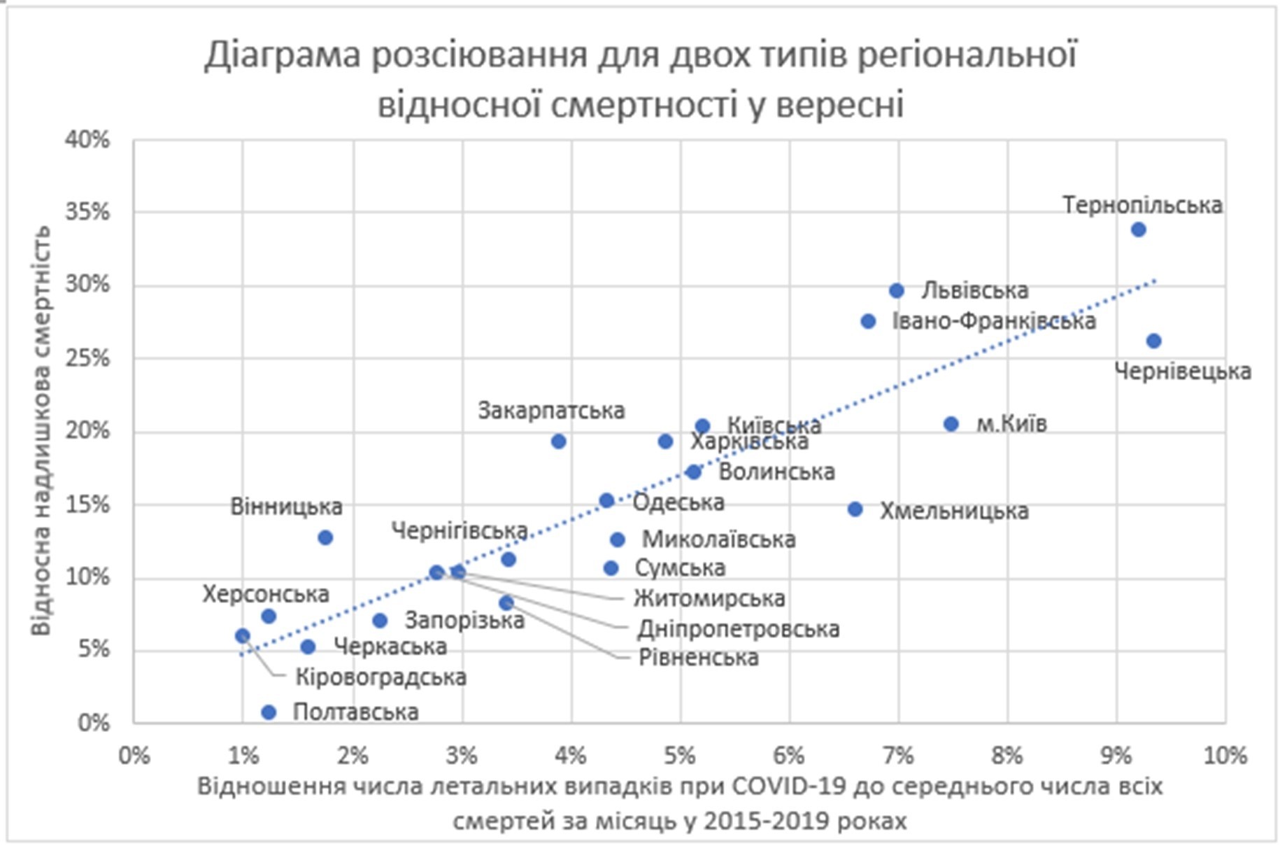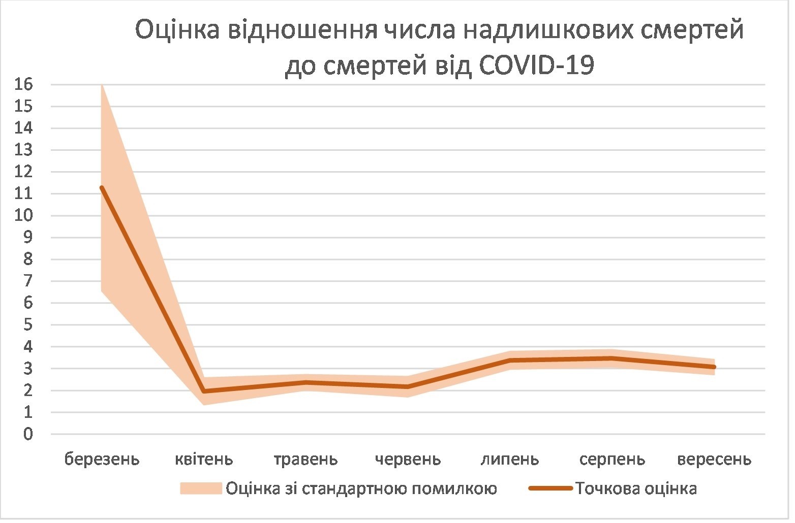 Оказывается, что в регионах Украины, где многие люди умерли от коронавируса, наблюдалась и избыточная смертность, которая примерно втрое превышала количество зафиксированных смертей от вируса SARS-СoV-2. Увеличение втрое оказалось примерно одинаковым в регионах, и оно наблюдалось в течение всего времени пандемии в Украине, начиная с марта.