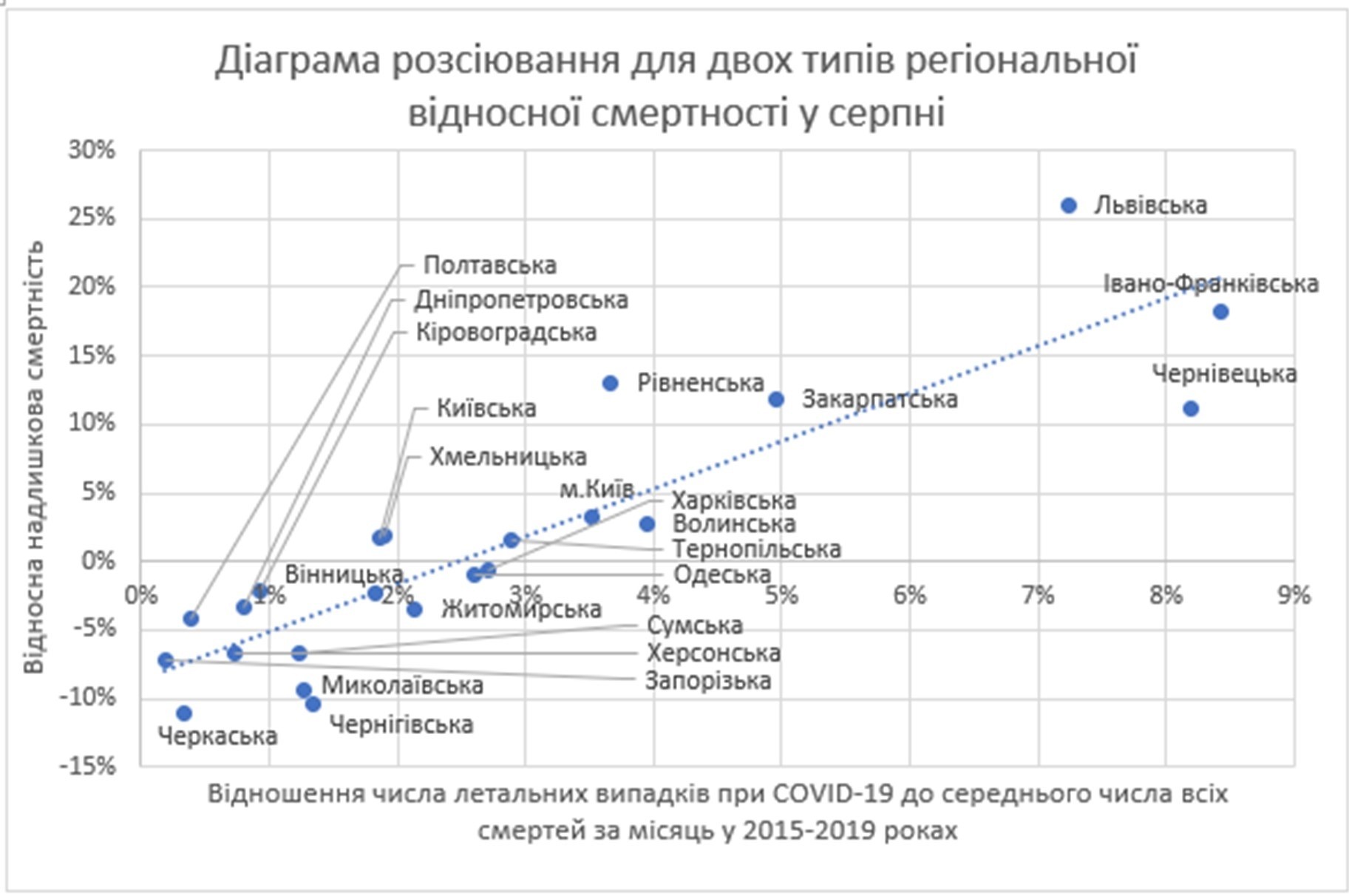 Рис. 7. Диаграмма рассеяния показателей смертности в августе
