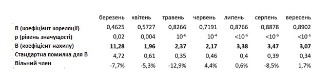 Встал вопрос: а что же было в другие месяцы? Оказалось, что примерно то же самое. Во все месяцы пандемии в Украине регрессионная прямая показывала наклон в сторону увеличения общей смертности в тех регионах, где было много покойников с подтвержденным COVID-19, еще и со все большим коэффициентом (см., например, рис. 7 для августа; рисунки для остальных месяцев есть в «Прогнозе РГ-30»). Менялся лишь ожидаемый уровень смертности при нулевом значении смертей от вируса («базовая смертность»), который был вообще ниже, чем среднее значение за пять предыдущих лет. Его колебания могут быть связаны с особенностями ведения статистики Госстатом и другими факторами, влияющими на смертность по всем причинам (в частности Госстат весной сообщал о проблемах с получением данных в связи с карантинными ограничениями, и наибольшие отклонения оцененной базовой смертности от средней за пять предыдущих лет тоже приходятся на весну).