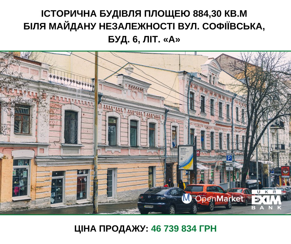 Государственный банк «Укрэксимбанк» на торгах OpenMarket ДП «СЕТАМ» Минюста продал историческое трехэтажное здание в Киеве недалеко от Майдана Незалежности (ул. Софиевская, д. 6, лит. «А»). Цена продажи здания-объекта культурного наследия составила 46 739 834 гривен.