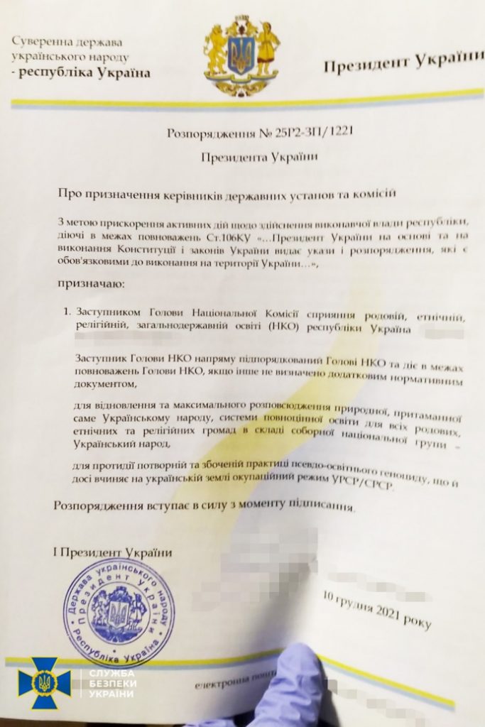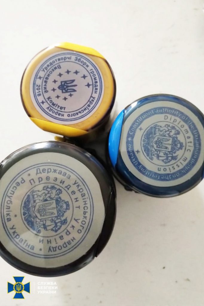 Во время обыска дома у задержанного изъяты печати и бланки фейковых псевдообразований, компьютерная техника и мобильные телефоны с доказательствами противоправной деятельности, «фейковые» распоряжения самопровозглашенных органов власти и «дипломатические паспорта» высокопоставленных чиновников.