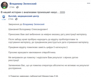 Вскоре после того, как несоответствие даты заметили пользователи, в Facebook Зеленского появилось объяснение: «В нашей истории с анализами произошел казус....))))))» и репост сообщения клиники, где объясняется, что при оформлении бланка ошибочно вместо 5 напечатали 2. Документ поменяли на аналогичный, но с датой забора 5 апреля. Подпись исполнителя на двух документах при этом существенно отличается, хотя указан один и тот же человек – Галаган Н.