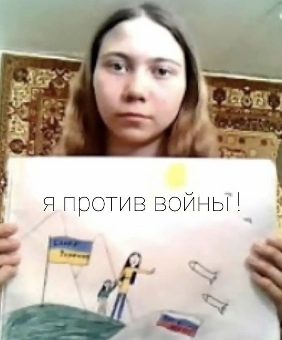 Ученица шестого класса одной из школ в Тульской области Маша Москалева нарисовала российский флаг с надписью «Нет войне» и украинский — с надписью «Слава Украине». На рисунке также изображены ракеты, летящие со стороны россии в сторону украинской женщины с ребенком.