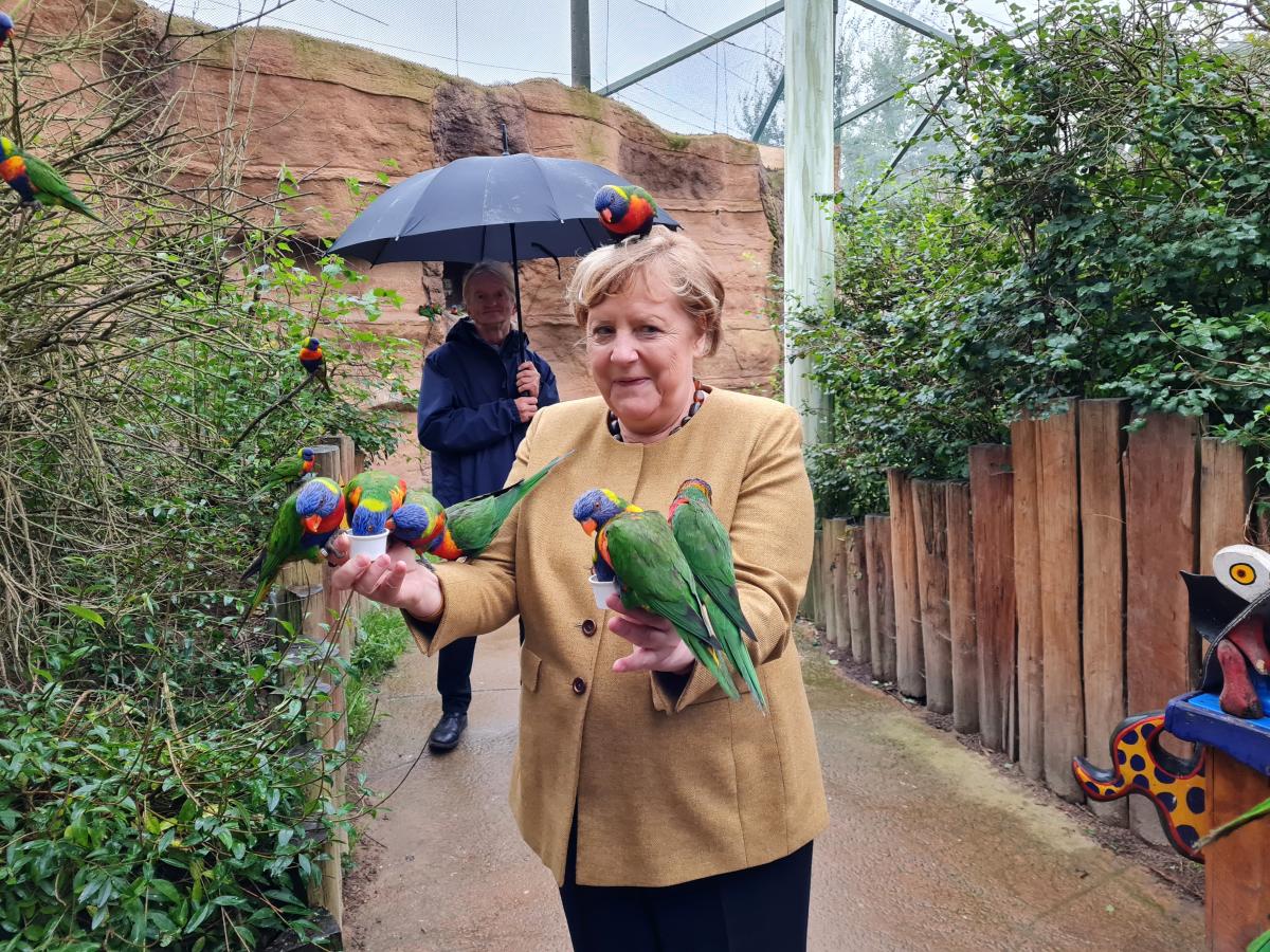Птички летали вокруг немецкого канцлера и ели из небольшого бумажного стаканчика, наполненного «нектаром лори», сделанного из пыльцы сушеных цветов, фруктового сахара, злаков и воды.