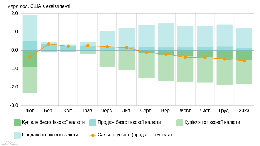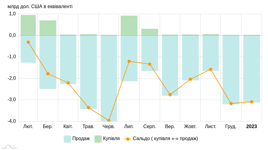 Національний банк України (НБУ) протягом тижня з 30 січня по 3 лютого 2023 року купив на міжбанківському валютному ринку 5,05 млн доларів і продав 782,57 млн доларів. Таким чином нНегативне сальдо інтервенцій склало 777,52 млн доларів.
