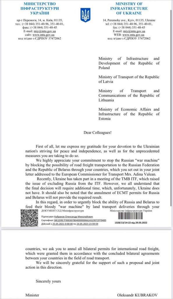 Він уточнив, що Україна минулого тижня офіційно звернулася до цих країн з проханням зупинити будь-яке автомобільне сполучення з росією і білоруссю.